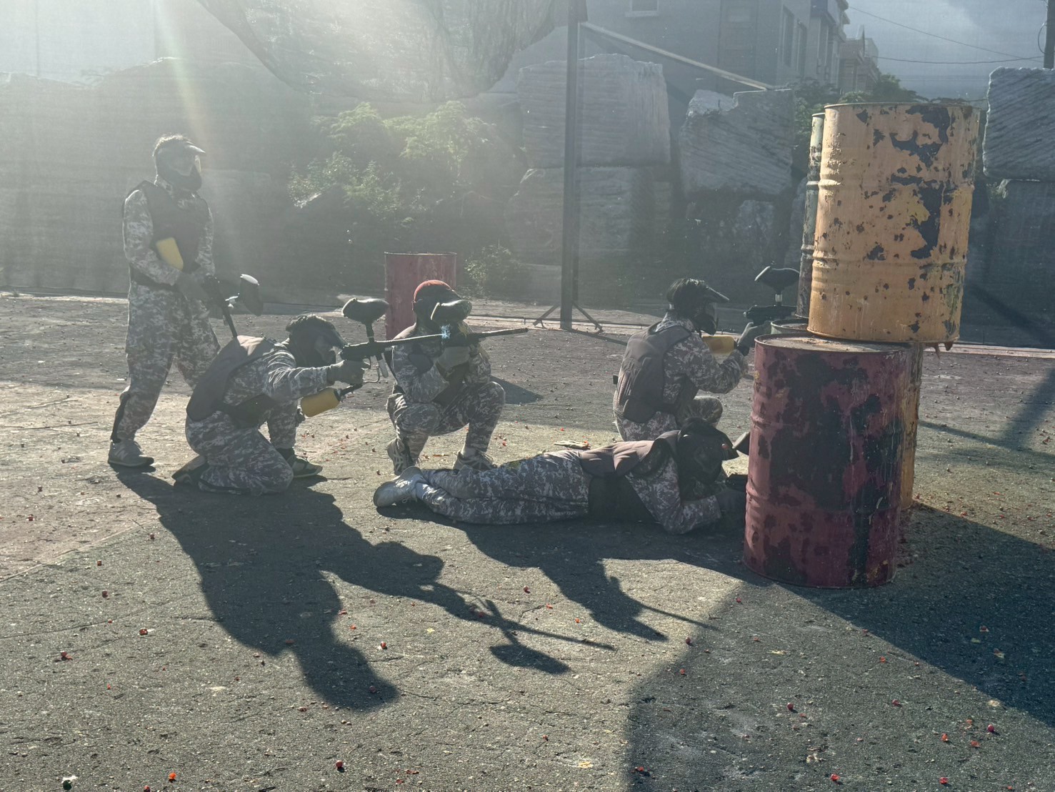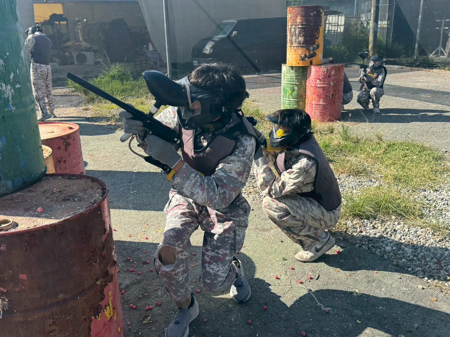 白天・漆彈場的熱血開戰。在艷陽照耀的場地上,少年們穿上防彈背心、戴上面罩、握緊漆彈槍,隨著教練一聲哨響,戰場瞬間沸騰!有人衝鋒陷陣、有人巧妙掩護隊友,也有人邊喊邊笑,漆彈擊中身體的「啪」聲與驚呼交織成青春交響曲。那股疼痛,不再只是刺激,而是一種「我們並肩作戰」的印記。比賽結束時,大家滿身顏料、滿臉笑容,連汗水都閃著歡樂的光。