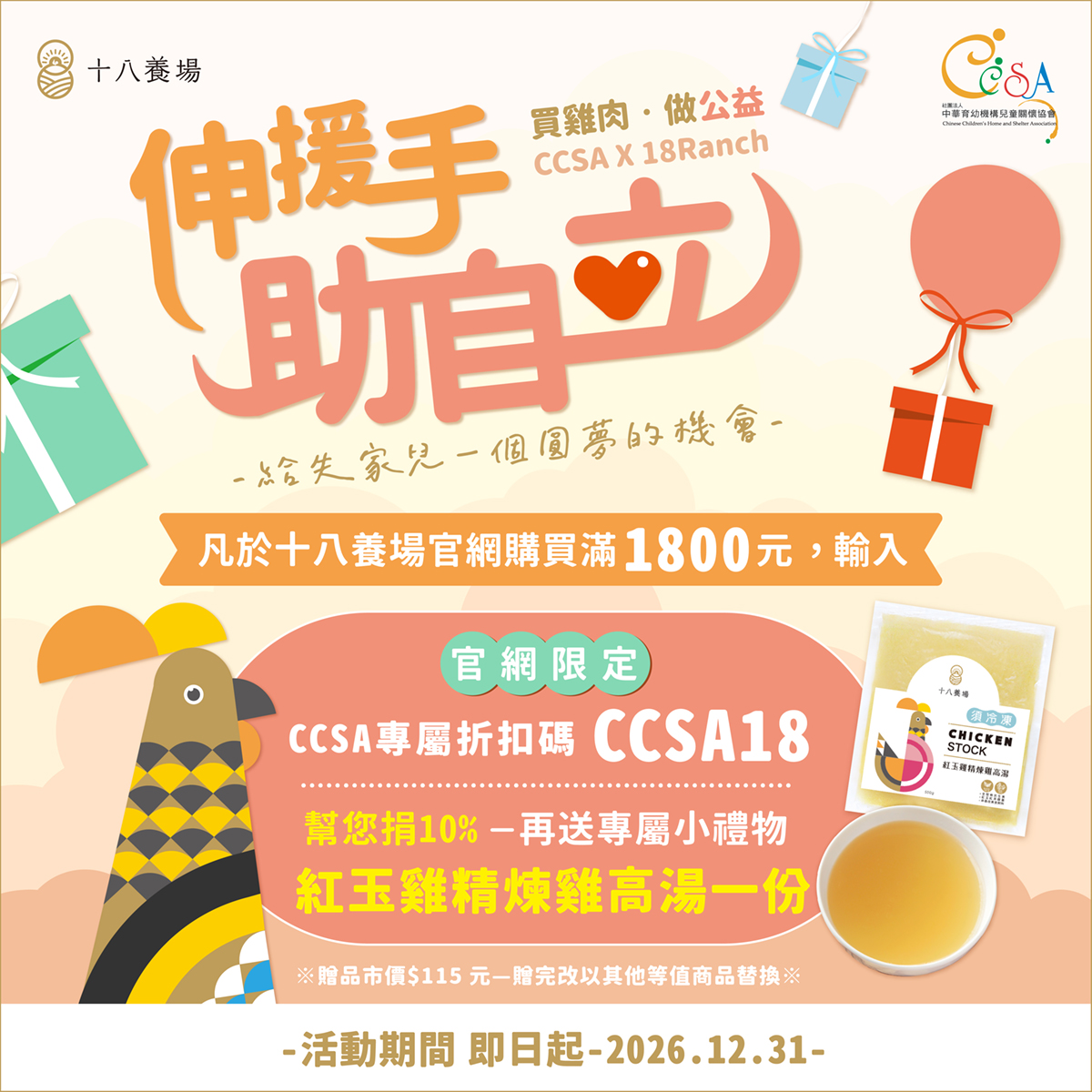 凡至十八養場消費達$1,800元(雞蛋不列入計算),並輸入專屬折扣碼「CCSA18」,即可獲贈送「紅玉雞精煉雞高湯」一份,十八養場會捐出總金額之10%款項予協會,用於兒少們住宿協助、就學輔導、社會就業等各項經濟補助,讓社會各方善信成為這些孩童最堅強的支柱,期待他們可以更自信地面對未來!